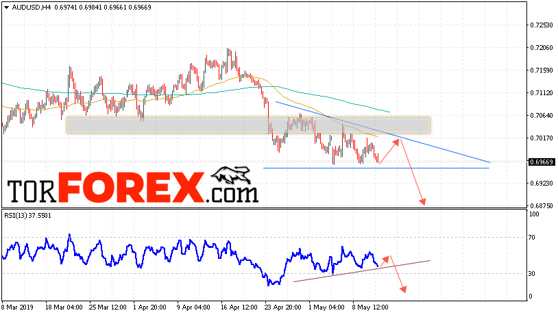 Таким образом, AUD/USD прогноз Форекс и аналитика на 14 мая 2019 предполагает попытку теста уровня сопротивления вблизи области 0.7015. Далее, продолжение падения котировок пары ниже уровня вблизи уровня 0.6875. Дополнительным сигналом в пользу снижения пары выступит тест линии тренда на индикаторе относительной силы. Отменой варианта падения станет сильный рост и пробой области 0.7055. Это укажет на продолжение подъёма котировок с потенциальной целью выше уровня 0.7145.
