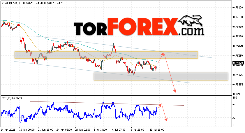 Таким образом, AUD/USD прогноз Форекс и аналитика на 15 июля 2021 предполагает попытку теста уровня сопротивления вблизи области 0.7525. Далее, продолжение падения котировок пары ниже уровня 0.7295. Дополнительным сигналом в пользу снижения пары выступит тест линии тренда на индикаторе относительной силы. Отменой варианта падения станет сильный рост и пробой области 0.7605. Это укажет на продолжение подъёма котировок с потенциальной целью выше уровня 0.7855.