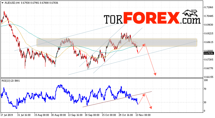 Таким образом, AUD/USD прогноз Форекс и аналитика на 15 ноября 2019 предполагает попытку теста уровня сопротивления вблизи области 0.6855. Далее, продолжение падения котировок пары ниже уровня вблизи уровня 0.6615. Дополнительным сигналом в пользу снижения пары выступит тест линии сопротивления на индикаторе относительной силы. Отменой варианта снижения станет сильный рост и пробой области 0.6945. Это укажет на продолжение подъёма котировок с потенциальной целью выше уровня 0.7175.