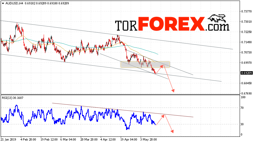 В пользу падения пары AUD/USD выступит тест нисходящей линии тренда на индикаторе относительной силы. Вторым сигналом выступит тест верхней границы нисходящего канала. Отменой варианта падения котировок Австралийского Доллара станет сильный рост и пробой уровня 0.7015. Это укажет на пробой сопротивления и продолжение роста AUD/USD на Форекс с потенциальной целью выше уровня 0.7115. Ожидать подтверждения падения пары стоит с пробоем области поддержки и закрытием котировок ниже уровня 0.6895.