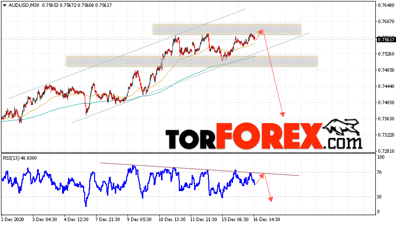 Таким образом, AUD/USD прогноз Форекс и аналитика на 17 декабря 2020 предполагает попытку теста уровня сопротивления вблизи области 0.7575. Далее, продолжение падения котировок пары ниже уровня 0.7365. Дополнительным сигналом в пользу снижения пары выступит тест линии тренда на индикаторе относительной силы. Отменой варианта падения станет сильный рост и пробой области 0.7645. Это укажет на продолжение подъёма котировок с потенциальной целью выше уровня 0.7875.