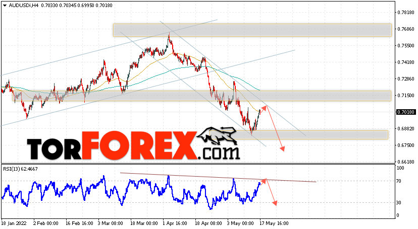 Таким образом, AUD/USD прогноз Форекс и аналитика на 18 мая 2022 предполагает попытку теста уровня сопротивления вблизи области 0.7035. Далее, продолжение падения котировок пары ниже уровня 0.6725. Дополнительным сигналом в пользу снижения пары выступит тест линии тренда на индикаторе относительной силы. Отменой варианта падения станет сильный рост и пробой области 0.7175. Это укажет на продолжение подъёма котировок с потенциальной целью выше уровня 0.7325.