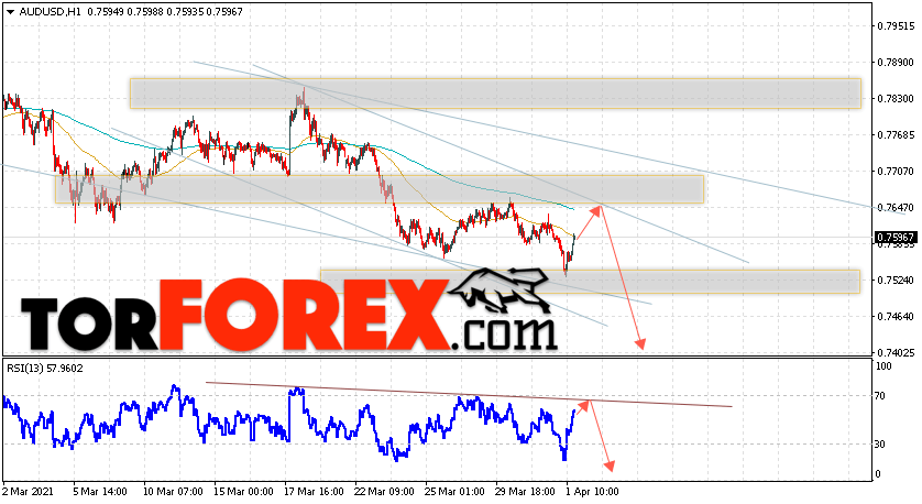 Таким образом, AUD/USD прогноз Форекс и аналитика на 2 апреля 2021 предполагает попытку теста уровня сопротивления вблизи области 0.7645. Далее, продолжение падения котировок пары ниже уровня 0.7405. Дополнительным сигналом в пользу падения пары выступит тест линии тренда на индикаторе относительной силы. Отменой варианта снижения станет сильный рост и пробой области 0.7735. Это укажет на продолжение подъёма котировок с потенциальной целью выше уровня 0.8205.