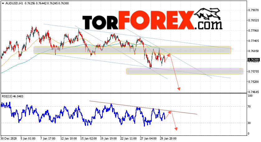 Таким образом, AUD/USD прогноз Форекс и аналитика на 2 февраля 2021 предполагает попытку теста уровня сопротивления вблизи области 0.7660. Далее, продолжение падения котировок пары ниже уровня 0.7465. Дополнительным сигналом в пользу снижения пары выступит тест линии тренда на индикаторе относительной силы. Отменой варианта падения станет сильный рост и пробой области 0.7745. Это укажет на продолжение роста котировок с потенциальной целью выше уровня 0.7985.