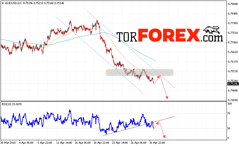 Валютная пара Австралийский Доллар к Доллару США AUD/USD продолжает движение в рамках нисходящего канала. На данный момент стоит ожидать попытку теста области сопротивления вблизи уровня 0.7530 и продолжение падения котировок в область ниже уровня 0.7440.