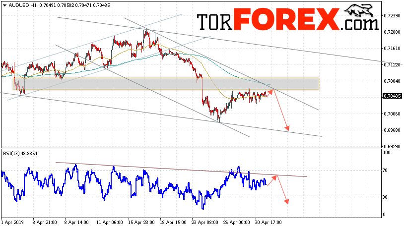 Таким образом, AUD/USD прогноз Форекс и аналитика на 2 мая 2019 предполагает попытку теста уровня сопротивления вблизи области 0.7070. Далее, продолжение падения котировок пары ниже уровня вблизи уровня 0.6965. Дополнительным сигналом в пользу снижения пары выступит тест линии тренда на индикаторе относительной силы. Отменой варианта падения станет сильный рост и пробой области 0.7105. Это укажет на продолжение подъёма котировок с потенциальной целью выше уровня 0.7205.