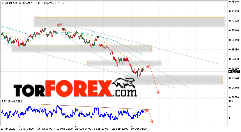 Таким образом, AUD/USD прогноз Форекс и аналитика на 20 октября 2022 предполагает попытку теста уровня сопротивления вблизи области 0.6335. Далее, продолжение падения котировок пары ниже уровня 0.5865. Дополнительным сигналом в пользу снижения пары выступит тест линии тренда на индикаторе относительной силы. Отменой варианта падения станет сильный рост и пробой области 0.6505. Это укажет на продолжение подъёма котировок с потенциальной целью выше уровня 0.6765.