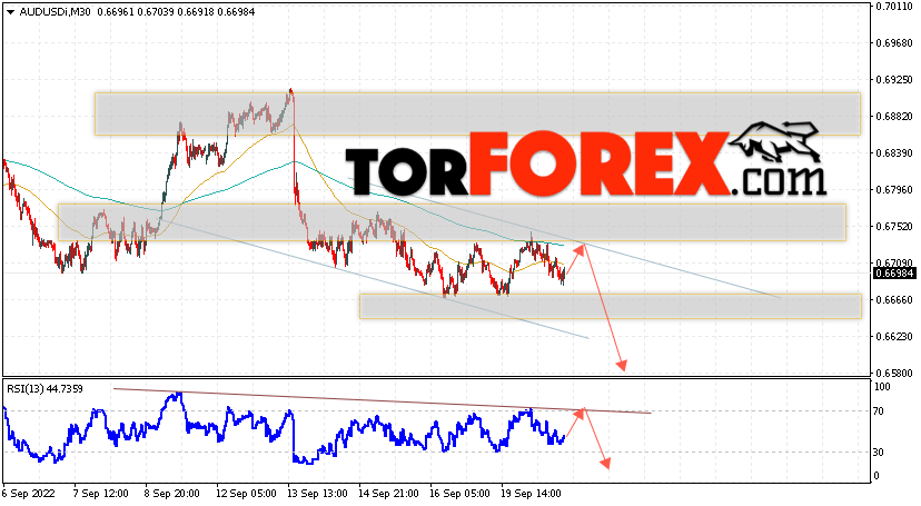 Таким образом, AUD/USD прогноз Форекс и аналитика на 21 сентября 2022 предполагает попытку теста уровня сопротивления вблизи области 0.6725. Далее, продолжение падения котировок пары ниже уровня 0.6575. Дополнительным сигналом в пользу снижения пары выступит тест линии тренда на индикаторе относительной силы. Отменой варианта падения станет сильный рост и пробой области 0.6785. Это укажет на продолжение подъёма котировок с потенциальной целью выше уровня 0.7245.