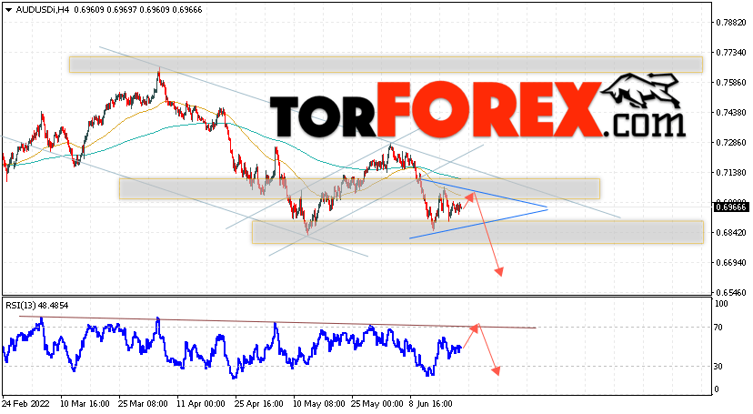 Таким образом, AUD/USD прогноз Форекс и аналитика на 2 июня 2022 предполагает попытку теста уровня сопротивления вблизи области 0.6985. Далее, продолжение падения котировок пары ниже уровня 0.6675. Дополнительным сигналом в пользу снижения пары выступит тест линии тренда на индикаторе относительной силы. Отменой варианта падения станет сильный рост и пробой области 0.7175. Это укажет на продолжение подъёма котировок с потенциальной целью выше уровня 0.7345.
