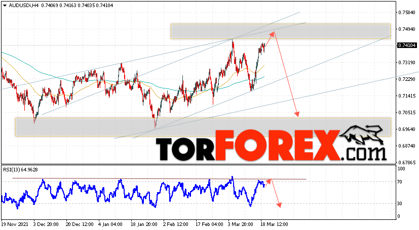 Таким образом, AUD/USD прогноз Форекс и аналитика на 22 марта 2022 предполагает попытку теста уровня сопротивления вблизи области 0.7475. Далее, продолжение падения котировок пары ниже уровня 0.7035. Дополнительным сигналом в пользу снижения пары выступит тест линии тренда на индикаторе относительной силы. Отменой варианта падения станет сильный рост и пробой области 0.7575. Это укажет на продолжение подъёма котировок с потенциальной целью выше уровня 0.7825.
