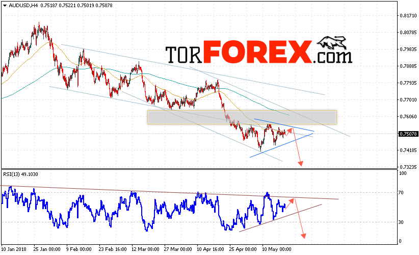 Таким образом, AUD/USD прогноз Форекс и аналитика на 22 мая 2018 предполагает попытку теста верхней границы канала вблизи области 0.7540 и продолжение падения котировок ниже уровня 0.7325, дополнительным сигналом в пользу падения пары выступит тест линии тренда на индикаторе относительной силы, отменой варианта снижения пары станет сильный рост и пробой области 0.7635.