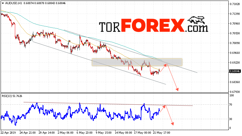 Таким образом, AUD/USD прогноз Форекс и аналитика на 23 мая 2019 предполагает попытку теста уровня сопротивления вблизи области 0.6925. Далее, продолжение падения котировок пары ниже уровня вблизи уровня 0.6790. Дополнительным сигналом в пользу снижения пары выступит тест линии тренда на индикаторе относительной силы. Отменой варианта падения станет сильный рост и пробой области 0.6965. Это укажет на продолжение подъёма котировок с потенциальной целью выше уровня 0.7105.