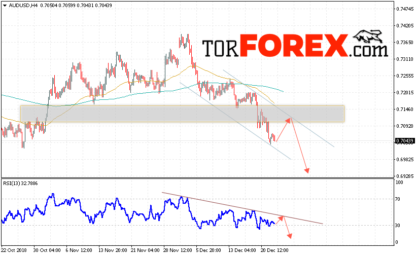 Таким образом, AUD/USD прогноз Форекс и аналитика на 26 декабря 2018 предполагает попытку теста уровня сопротивления вблизи области 0.7100. Далее, продолжение снижения котировок пары ниже уровня 0.6930. Дополнительным сигналом в пользу падения пары выступит тест линии тренда на индикаторе относительной силы. Отменой варианта снижения станет сильный рост и пробой области 0.7165. Это укажет на продолжение роста котировок.