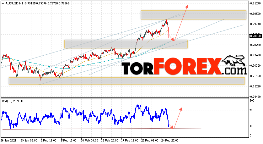 Таким образом, AUD/USD прогноз Форекс и аналитика на 26 февраля 2021 предполагает попытку теста уровня поддержки вблизи области 0.7845. Далее, продолжение роста котировок пары выше уровня 0.8125. Дополнительным сигналом в пользу подъёма пары выступит тест линии тренда на индикаторе относительной силы. Отменой варианта роста станет падение и пробой области 0.7775. Это укажет на продолжение снижения котировок с потенциальной целью ниже уровня 0.7515.