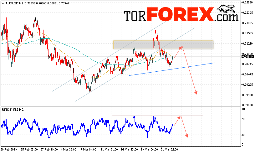 Таким образом, AUD/USD прогноз Форекс и аналитика на 26 марта 2019 предполагает попытку теста уровня сопротивления вблизи области 0.7115. Далее, продолжение падения котировок пары ниже уровня вблизи уровня 0.6995. Дополнительным сигналом в пользу снижения пары выступит тест линии тренда на индикаторе относительной силы. Отменой варианта падения станет сильный рост и пробой области 0.7180. Это укажет на продолжение подъёма котировок с потенциальной целью выше уровня 0.7295.