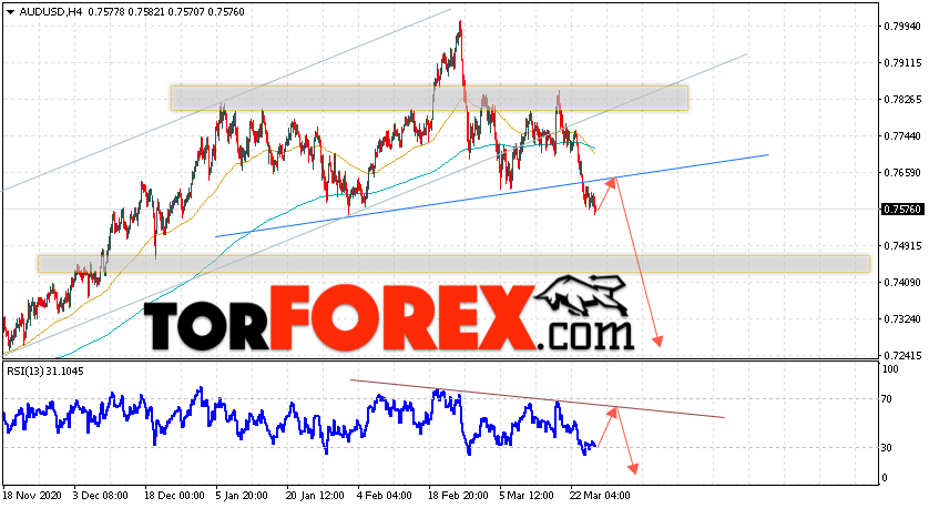 Таким образом, AUD/USD прогноз Форекс и аналитика на 26 марта 2021 предполагает попытку теста уровня сопротивления вблизи области 0.7645. Далее, продолжение падения котировок пары ниже уровня 0.7255. Дополнительным сигналом в пользу падения пары выступит тест линии тренда на индикаторе относительной силы. Отменой варианта снижения станет сильный рост и пробой области 0.7895. Это укажет на продолжение подъёма котировок с потенциальной целью выше уровня 0.8275.