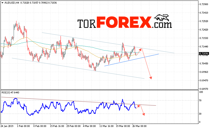 Таким образом, AUD/USD прогноз Форекс и аналитика на 28 марта 2019 предполагает попытку теста уровня сопротивления вблизи области 0.7125. Далее, продолжение падения котировок пары ниже уровня вблизи уровня 0.6945. Дополнительным сигналом в пользу снижения пары выступит тест линии тренда на индикаторе относительной силы. Отменой варианта падения станет сильный рост и пробой области 0.7180. Это укажет на продолжение подъёма котировок с потенциальной целью выше уровня 0.7295.