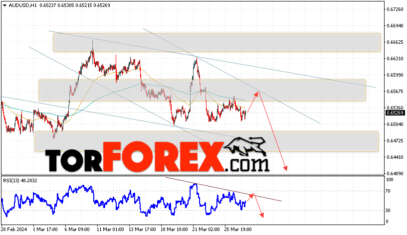 Таким образом, AUD/USD прогноз Форекс и аналитика на 28 марта 2024 предполагает попытку теста уровня сопротивления вблизи области 0.6565. Далее, продолжение падения котировок пары ниже уровня 0.6405. Дополнительным сигналом в пользу снижения пары выступит тест линии тренда на индикаторе относительной силы. Отменой варианта снижения станет сильный рост и пробой области 0.6615. Это укажет на продолжение подъёма котировок с потенциальной целью выше уровня 0.6975.