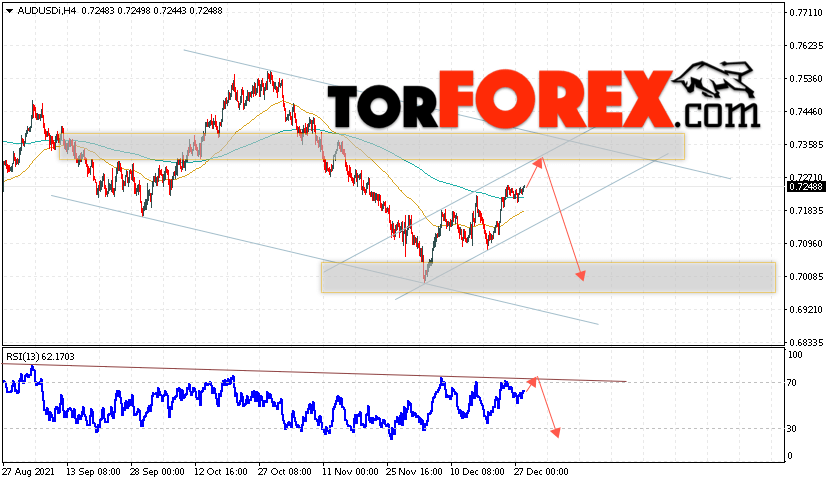 Таким образом, AUD/USD прогноз Форекс и аналитика на 29 декабря 2021 предполагает попытку теста уровня сопротивления вблизи области 0.7315. Далее, продолжение падения котировок пары ниже уровня 0.7005. Дополнительным сигналом в пользу снижения пары выступит тест линии тренда на индикаторе относительной силы. Отменой варианта падения станет сильный рост и пробой области 0.7455. Это укажет на продолжение подъёма котировок с потенциальной целью выше уровня 0.7685.