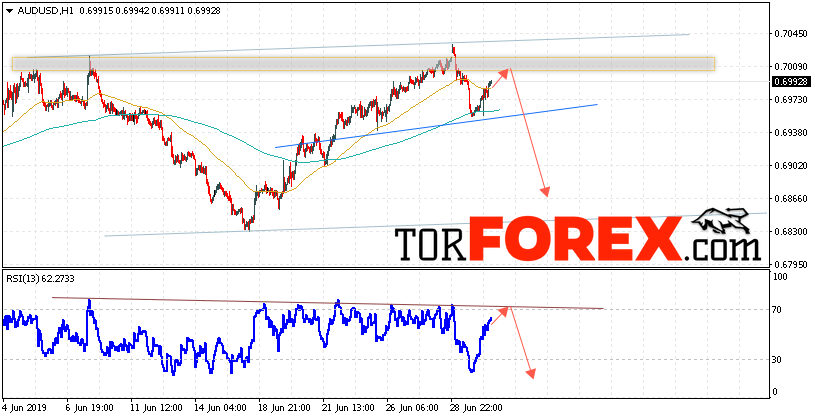 Таким образом, AUD/USD прогноз Форекс и аналитика на 3 июля 2019 предполагает попытку теста уровня сопротивления вблизи области 0.7005. Далее, продолжение падения котировок пары ниже уровня вблизи уровня 0.6815. Дополнительным сигналом в пользу снижения пары выступит тест линии тренда на индикаторе относительной силы. Отменой варианта падения станет сильный рост и пробой области 0.7065. Это укажет на продолжение подъёма котировок с потенциальной целью выше уровня 0.7155.