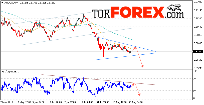 В пользу снижения пары AUD/USD выступит тест линии тренда на индикаторе относительной силы. Вторым сигналом станет отскок от верхней границы модели «Треугольник». Отменой варианта падения котировок Австралийского Доллара станет сильный рост и пробой уровня 0.6815. Это укажет на пробой верхней границы модели «Треугольник» и продолжение роста AUD/USD на Форекс с потенциальной целью выше уровня 0.7025. Ожидать подтверждения падения пары стоит с пробоем области поддержки и закрытием котировок ниже уровня 0.6645.