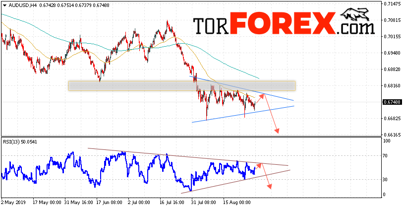 В пользу снижения пары AUD/USD выступит тест линии сопротивления на индикаторе относительной силы. Вторым сигналом станет отскок от верхней границы модели «Треугольник». Отменой варианта падения котировок Австралийского Доллара станет сильный рост и пробой уровня 0.6825. Это укажет на пробой верхней границы паттерна и продолжение роста AUD/USD на Форекс с потенциальной целью выше уровня 0.7005. Ожидать подтверждения падения пары стоит с пробоем области поддержки и закрытием котировок ниже уровня 0.6655.