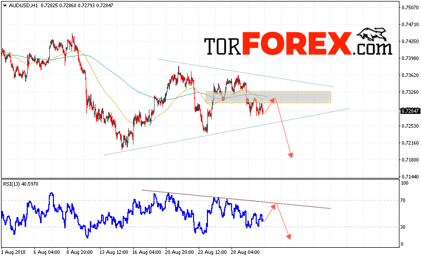 Таким образом, AUD/USD прогноз Форекс и аналитика на 31 августа 2018 предполагает попытку теста уровня сопротивления вблизи области 0.7320 и продолжение падения котировок пары ниже уровня 0.7180, дополнительным сигналом в пользу падения пары выступит тест области сопротивления на индикаторе относительной силы, отменой варианта снижения пары станет сильный рост и пробой области 0.7370, что укажет на продолжение роста в рамках отработки модели «Треугольник».