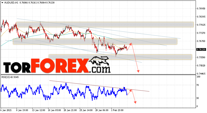 Таким образом, AUD/USD прогноз Форекс и аналитика на 5 февраля 2021 предполагает попытку теста уровня сопротивления вблизи области 0.7645. Далее, продолжение падения котировок пары ниже уровня 0.7455. Дополнительным сигналом в пользу снижения пары выступит тест линии тренда на индикаторе относительной силы. Отменой варианта падения станет сильный рост и пробой области 0.7735. Это укажет на продолжение роста котировок с потенциальной целью выше уровня 0.7975.