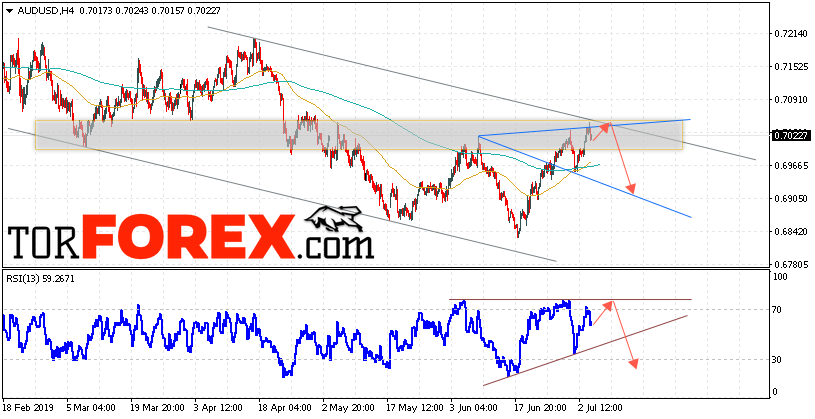 Таким образом, AUD/USD прогноз Форекс и аналитика на 5 июля 2019 предполагает попытку теста уровня сопротивления вблизи области 0.7050. Далее, продолжение падения котировок пары ниже уровня вблизи уровня 0.6915. Дополнительным сигналом в пользу снижения пары выступит тест линии тренда на индикаторе относительной силы. Отменой варианта падения станет сильный рост и пробой области 0.7095. Это укажет на продолжение подъёма котировок с потенциальной целью выше уровня 0.7195.