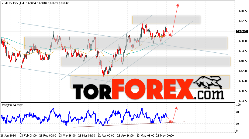 Таким образом, AUD/USD прогноз Форекс и аналитика на 5 июня 2024 предполагает попытку теста уровня поддержки вблизи области 0.6625. Далее, продолжение роста котировок пары выше уровня 0.6835. Дополнительным сигналом в пользу подъёма пары выступит тест линии тренда на индикаторе относительной силы. Отменой варианта падения станет сильный рост и пробой области 0.6515. Это укажет на продолжение подъёма котировок с потенциальной целью выше уровня 0.6325.