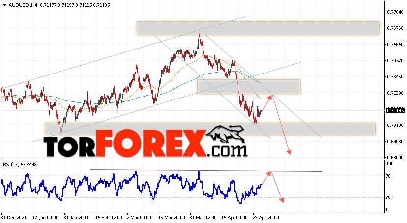 Таким образом, AUD/USD прогноз Форекс и аналитика на 5 мая 2022 предполагает попытку теста уровня сопротивления вблизи области 0.7145. Далее, продолжение падения котировок пары ниже уровня 0.6805. Дополнительным сигналом в пользу снижения пары выступит тест линии тренда на индикаторе относительной силы. Отменой варианта падения станет сильный рост и пробой области 0.7270. Это укажет на продолжение подъёма котировок с потенциальной целью выше уровня 0.7535.