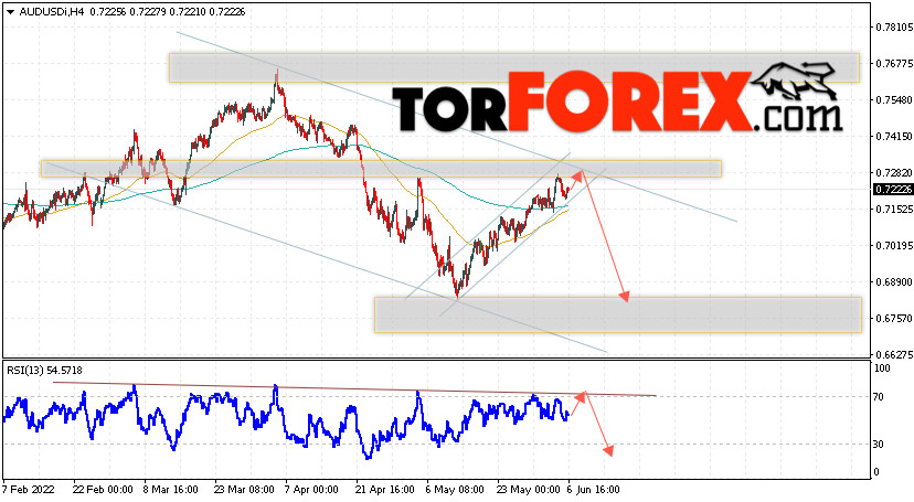 Таким образом, AUD/USD прогноз Форекс и аналитика на 7 июня 2022 предполагает попытку теста уровня сопротивления вблизи области 0.7285. Далее, продолжение падения котировок пары ниже уровня 0.6875. Дополнительным сигналом в пользу снижения пары выступит тест линии тренда на индикаторе относительной силы. Отменой варианта падения станет сильный рост и пробой области 0.7415. Это укажет на продолжение подъёма котировок с потенциальной целью выше уровня 0.7645.