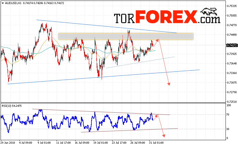 Таким образом, AUD/USD прогноз Форекс и аналитика на 1 августа 2018 предполагает попытку теста уровня сопротивления вблизи области 0.7420 и продолжение падения котировок пары ниже уровня 0.7305, дополнительным сигналом в пользу падения пары выступит тест линии тренда на индикаторе относительной силы, отменой варианта снижения пары станет сильный рост и пробой области 0.7465, что укажет на пробой верхней границы модели «Треугольник».