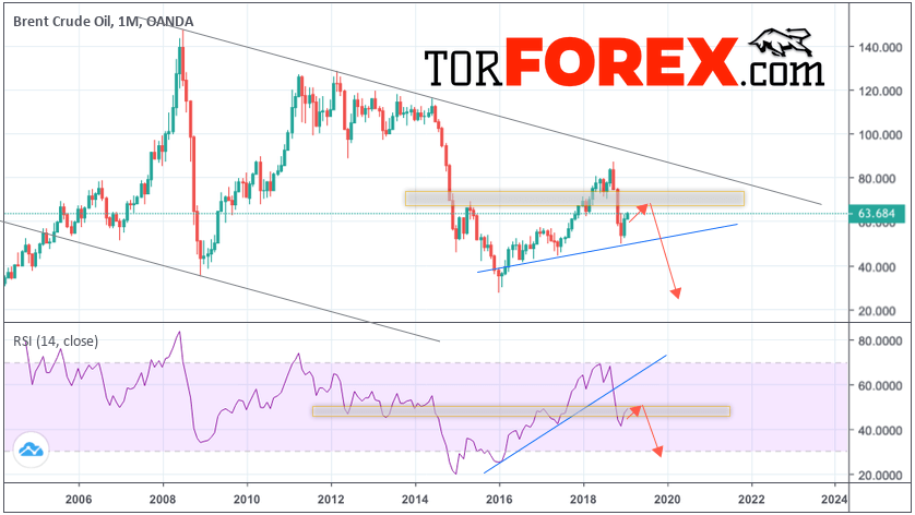В пользу снижения котировок и цен на нефть BRENT, в рамках прогноза на 2019 год, выступит тест области сопротивления на индикаторе относительной силы. Вторым сигналом станет формирования разворотной модели «Голова и плечи». Отменой варианта падения цен на нефть станет сильный рост и пробой уровня 85.00 долларов за баррель. Это укажет на пробой верхней границы канала и продолжение роста котировок в область выше уровня 120.00. Подтверждением падения котировок нефти в 2019 году выступит пробой уровня поддержки и закрытие цен на BRENT ниже уровня 45.00.