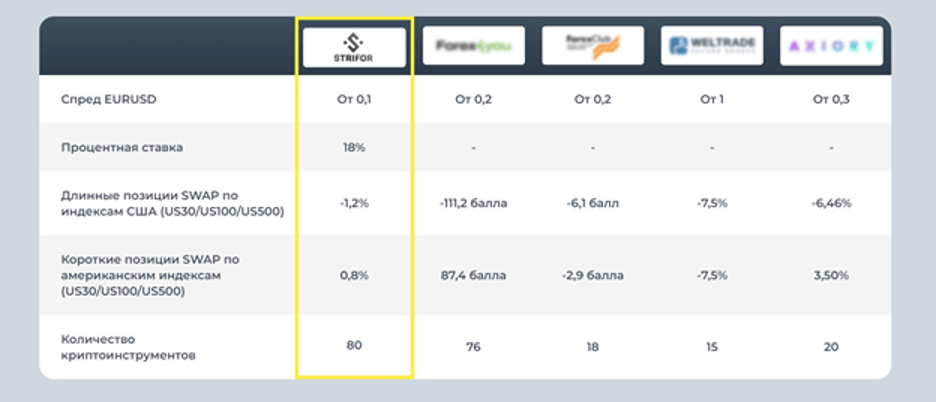 Как видно, Strifor предлагает более выгодные условия по спредам EUR/USD, длинным и коротким позициям SWAP по индексам США.