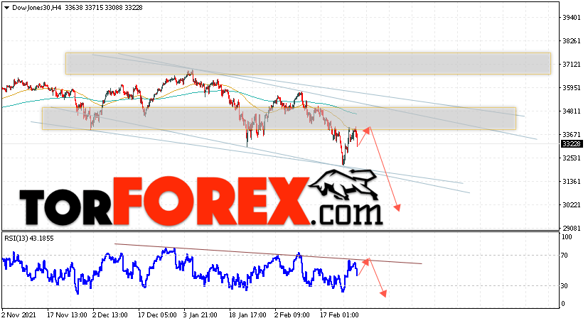 Дополнительным сигналом в пользу падения котировок биржевого индекса выступит тест линии сопротивления на индикаторе относительной силы. Вторым сигналом станет отскок от верхней границы нисходящего канала. Отменой варианта падения котировок индекса станет сильный рост и пробой области 35005. Это укажет на пробой уровня сопротивления и продолжение роста котировок индекса Dow Jones с целью выше уровня 37155. Ожидать ускорения падения котировок биржевого индекса стоит с пробоем области поддержки и закрытием котировок ниже области 31105.