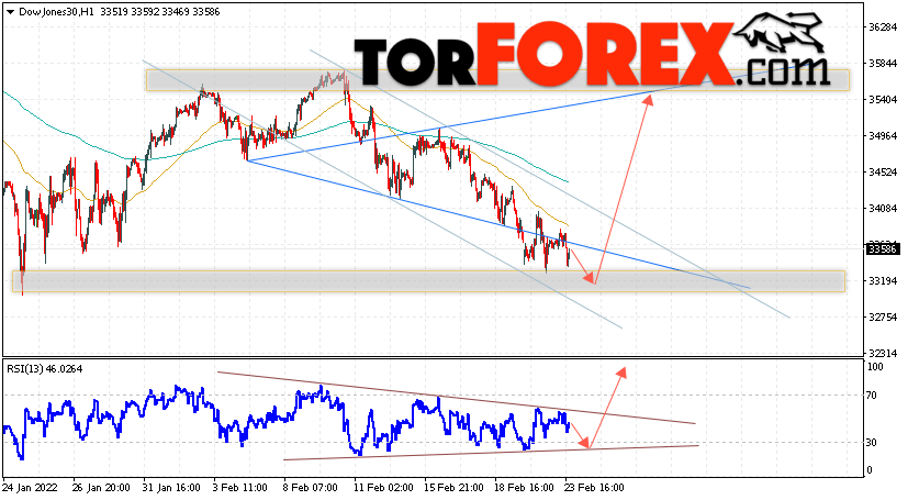 Таким образом, Dow Jones прогноз индекса на 24 февраля 2022 предполагает попытку теста уровня поддержки вблизи области 33195. Затем, продолжение роста в область выше уровня 35405. В пользу подъёма котировок Dow Jones выступит тест линии тренда на индикаторе относительной силы. Отменой варианта роста станет падение стоимости индекса и пробой области 33235. Это укажет на продолжение снижения с целью ниже области 32655.