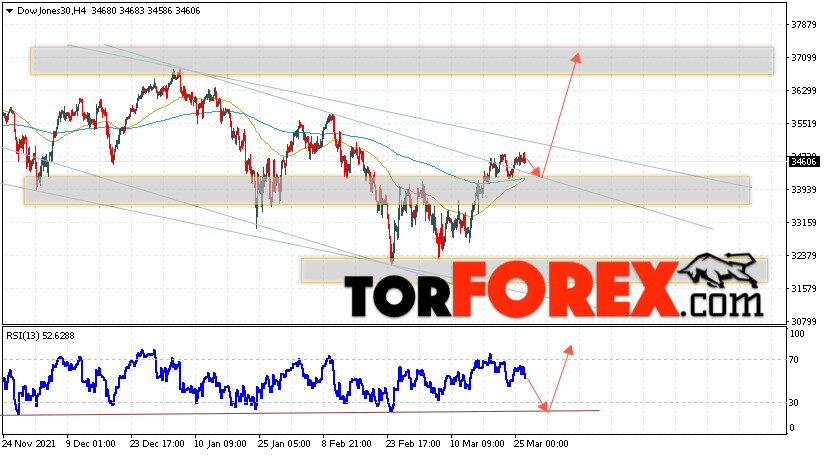 Таким образом, Dow Jones прогноз индекса на 29 марта 2022 предполагает попытку теста уровня поддержки вблизи области 34005. Затем, продолжение роста в область выше уровня 37055. В пользу роста котировок Dow Jones выступит тест линии тренда на индикаторе относительной силы. Отменой варианта подъёма станет падение стоимости индекса и пробой области 32805. Это укажет на продолжение снижения с целью ниже области 30905.