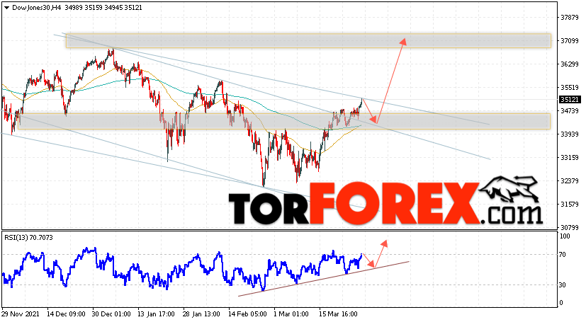 Таким образом, Dow Jones прогноз индекса на 30 марта 2022 предполагает попытку теста уровня поддержки вблизи области 34255. Затем, продолжение роста в область выше уровня 37105. В пользу роста котировок Dow Jones выступит тест линии тренда на индикаторе относительной силы. Отменой варианта подъёма станет падение стоимости индекса и пробой области 33655. Это укажет на продолжение снижения с целью ниже области 32405.