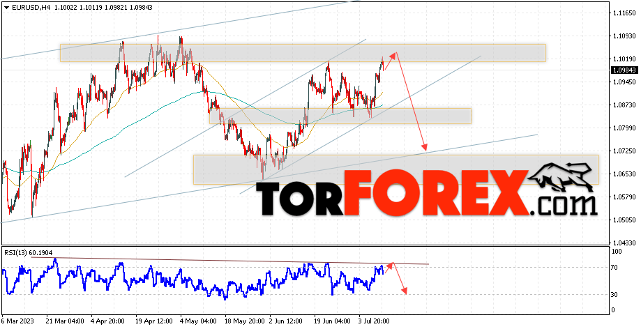 Таким образом, EUR/USD прогноз Евро Доллар на 12 июля 2023 предполагает попытку развития бычьей коррекции пары и тест области сопротивления вблизи уровня 1.1010. Откуда стоит рассматривать отскок цены вниз и попытку падения валютной пары на рынке в область ниже уровня 1.0735. Дополнительным сигналом в пользу снижения инструмента на рынке Форекс выступит тест линии тренда на индикаторе относительной силы (RSI). Отменой варианта с падением пары EUR/USD станет сильный рост котировок и пробой уровня 1.1095. Это укажет на пробой области сопротивления и продолжение роста валютной пары на Форекс в область выше уровня 1.1275.
