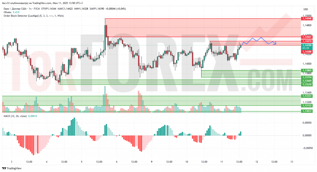 Пара EUR/USD продолжает торговаться в боковом диапазоне, демонстрируя неуверенную динамику после роста в начале июня. Цена консолидируется вблизи уровня 1,14400, где ранее наблюдалась активность продавцов. Отсутствие направленного импульса указывает на фазу накопления перед возможным резким движением. Поддержка в зоне 1,13700 удерживалась несколько раз, формируя локальную основу.