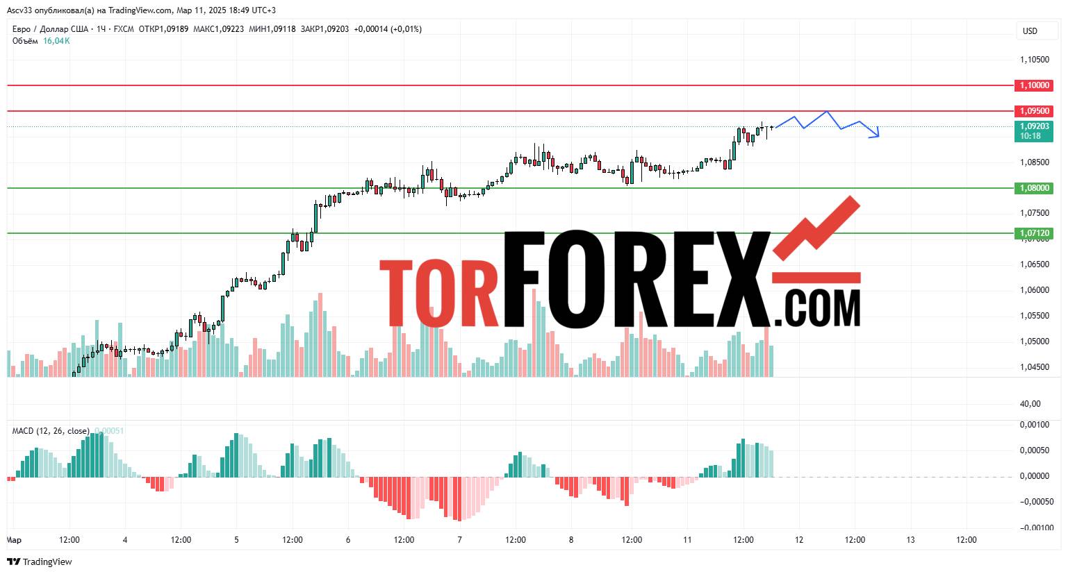 Технические индикаторы показывают, что рынок перегрет, что может привести к временной консолидации или откату. Если евро преодолеет 1,0950, это создаст предпосылки для тестирования 1,1000. В случае снижения ниже 1,0800, может начаться нисходящая коррекция.