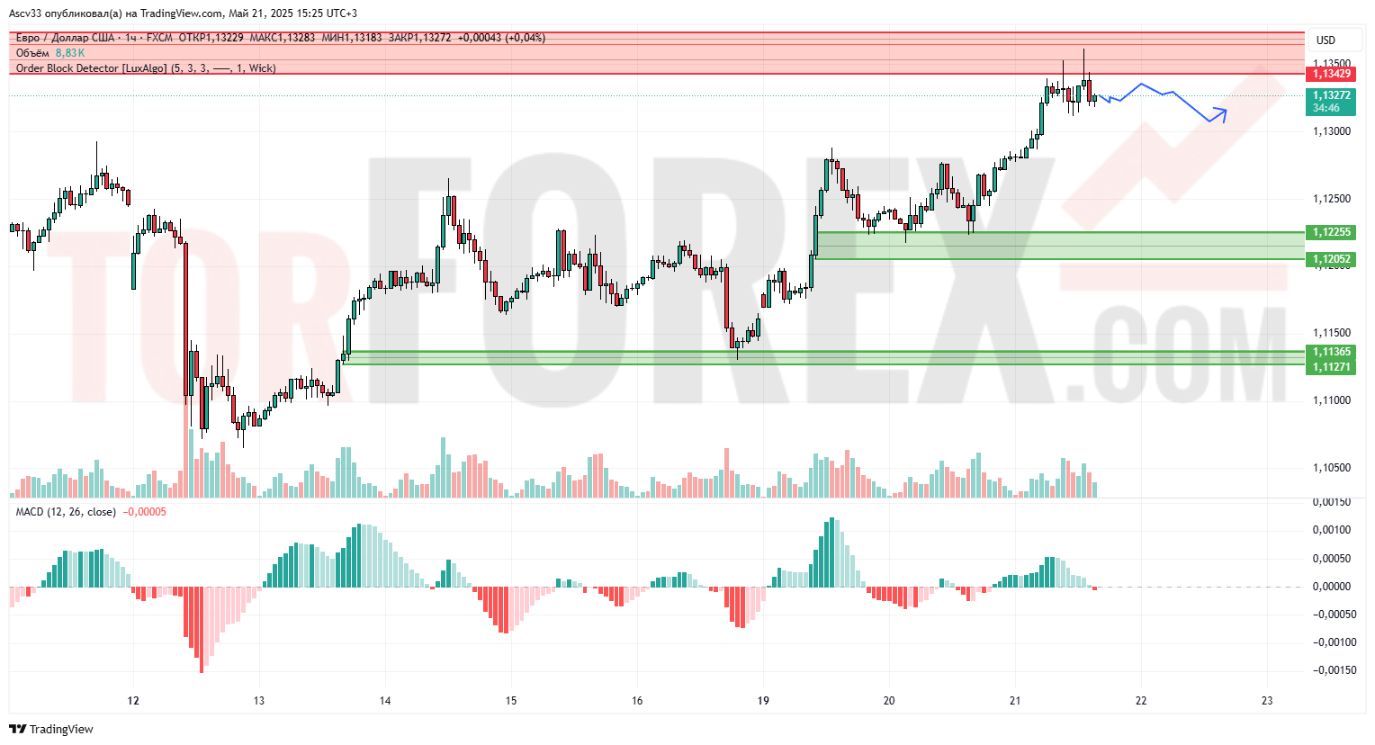 Ожидается формирование диапазона в пределах 1,1300–1,1340. Пробой ниже 1,1300 может привести к коррекции в область 1,1250. Закрепление выше 1,1345 откроет путь к 1,1365, однако текущая структура указывает на вероятность краткосрочного отката.