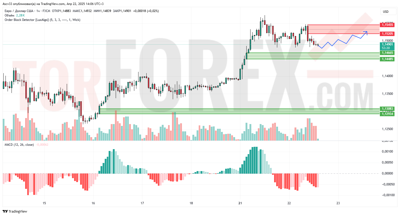 Пара EUR/USD консолидируется после волны роста, удерживая поддержку в районе 1.14665. Цена формирует устойчивую базу для возможного продолжения восходящего движения. MACD начинает разворот вверх от нулевой линии, что усиливает вероятность роста. Объёмы остаются стабильными, что поддерживает структуру рынка.