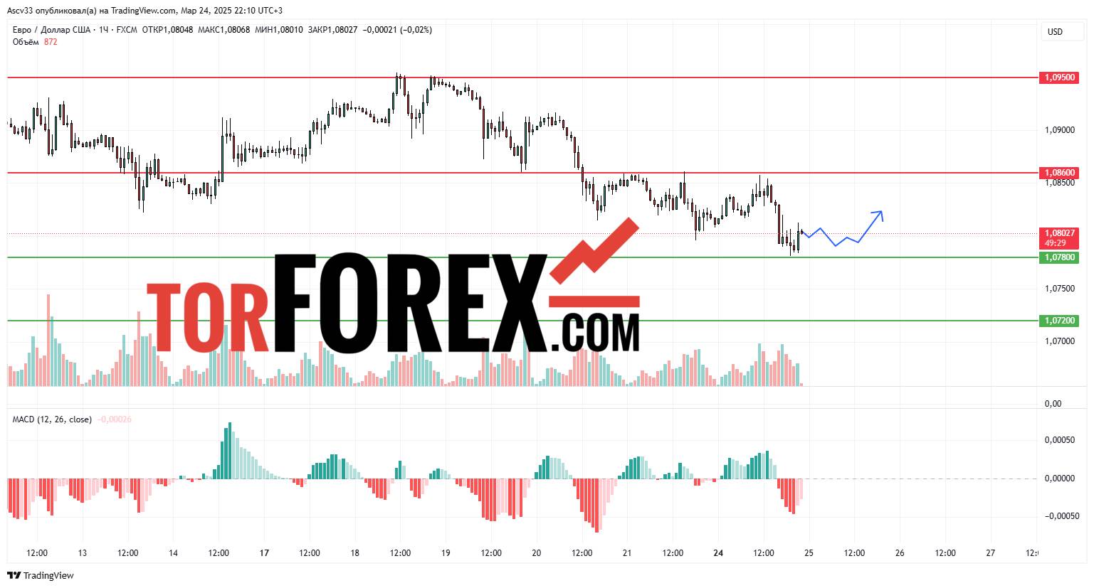 Ожидается, что EUR/USD останется в пределах 1,0780–1,0860 на 25 марта. Пробой 1,0860 вверх может подтвердить восходящее движение, тогда как закрытие ниже 1,0780 может усилить медвежьи настроения. Трейдерам стоит внимательно следить за изменениями курса вблизи этих критических уровней, так как их преодоление может оказать значительное влияние на дальнейшие действия на рынке.