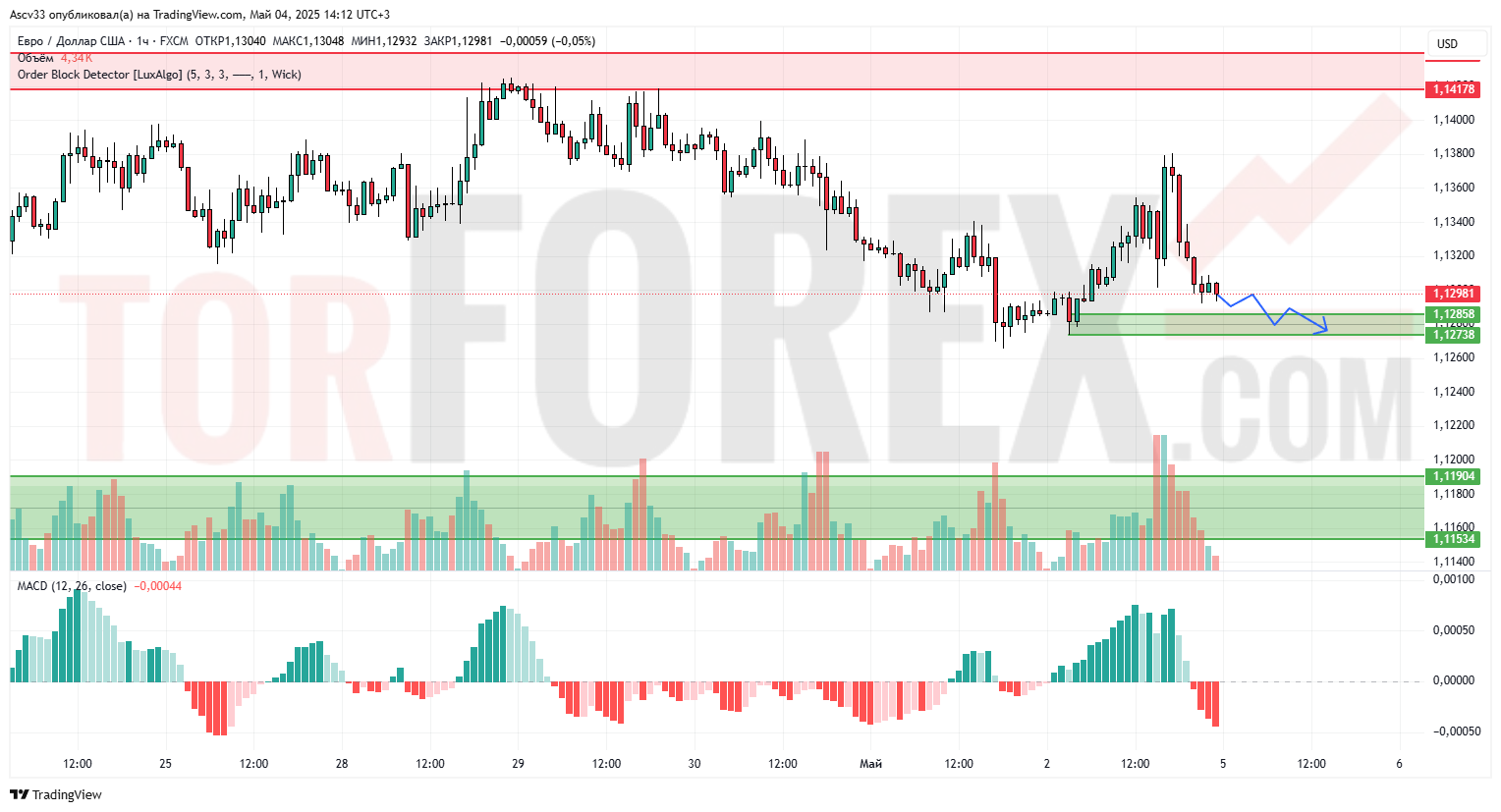 После коррекционного роста к уровню 1,1378 пара EUR/USD развернулась вниз и пробила локальную поддержку. Сейчас цена тестирует область 1,1285–1,1273 — зону, которая ранее выступала в роли поддержки. Давление продавцов сохраняется, о чём свидетельствует резкое снижение объемов на попытке восстановления и отрицательная динамика MACD.