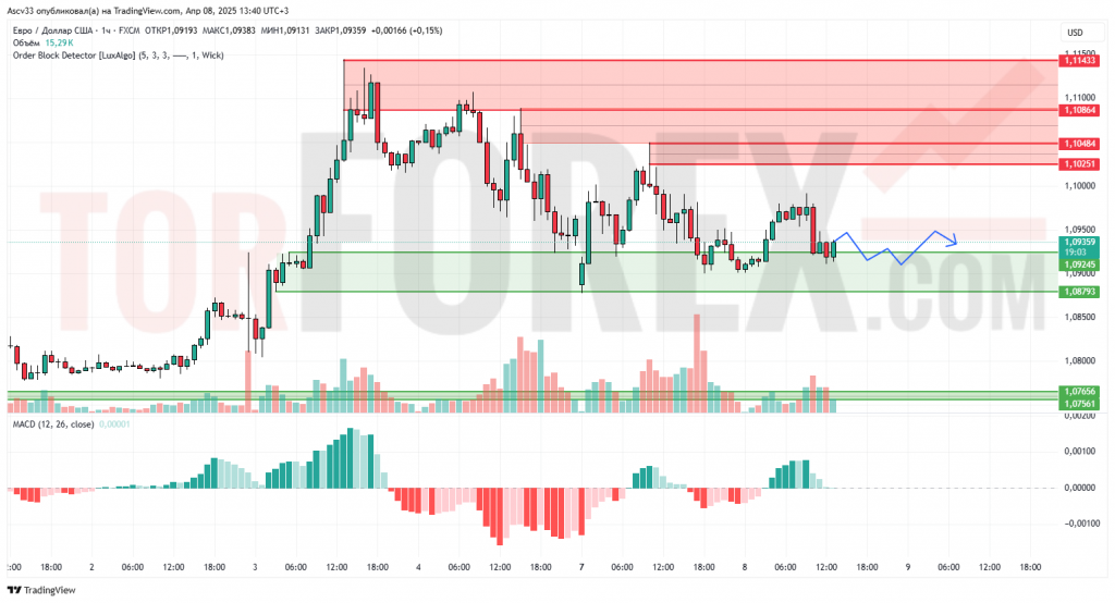 Пара EUR/USD торгуется в фазе боковой консолидации после отката от зоны предложения вблизи 1,1048. На часовом графике видим неудачную попытку роста к 1,0950, за которой последовало снижение на фоне умеренного объема. Структура напоминает нисходящий клин или формирование диапазона.