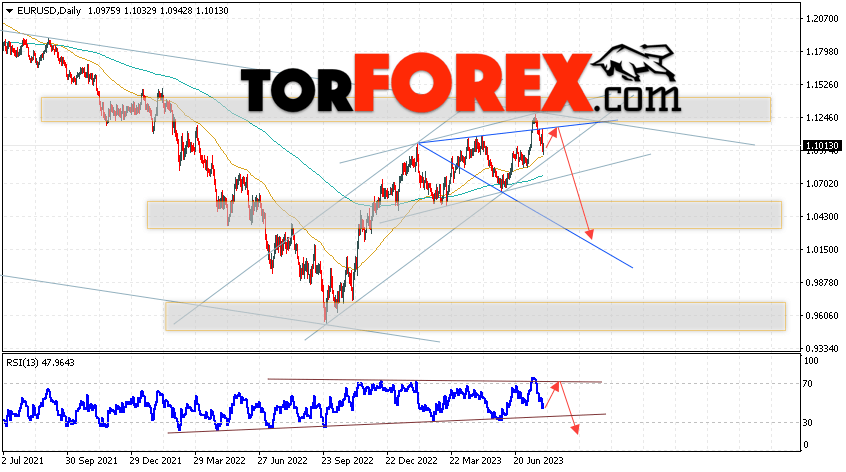 Таким образом, EUR/USD прогноз на неделю 31 июля — 4 августа 2023 предполагает попытку развития бычьей коррекции и тест области сопротивления вблизи уровня 1.1145. Откуда стоит ожидать отскок цены вниз и продолжения падения пары на рынке Форекс в область ниже уровня 1.0265. Дополнительным сигналом в пользу снижения выступит тест линии сопротивления на индикаторе относительной силы (RSI). Отменой варианта падения Евро Доллар станет сильный рост и пробой уровня 1.1475. В этом случае стоит ожидать продолжения подъёма пары с потенциальной целью на уровне 1.1935.