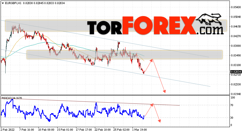 Валютная пара Евро Фунт EUR/GBP продолжает движение в рамках падения и нисходящего канала. Скользящие средние указывают на наличие краткосрочной бычьей тенденции по паре. Цены ушли вниз от области между сигнальным линиями, что указывает на давление со стороны продавцов европейской валюты против британского фунта и потенциальное продолжение падения уже с текущих уровней. В момент публикации прогноза курс Евро к Фунту составляет 0.8283. В рамках Форекс прогноза EUR/GBP на 4 марта 2022 стоит ожидать попытку развития бычьей коррекции и тест уровня поддержки вблизи области 0.8345. Далее, отскок вниз и продолжение падения валютной пары Евро Фунт. Потенциальной целью такого движения на Форекс выступает область ниже уровня 0.8195.