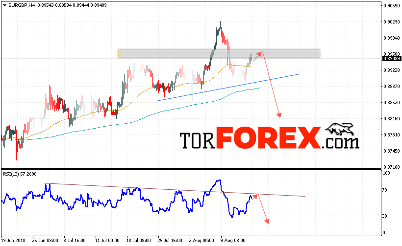 В пользу снижения пары EUR/GBP выступит тест линии тренда на индикаторе относительной силы, а также формирование разворотной модели «Голова и плечи». Отменой варианта падения котировок валютной пары Евро Фунт на Форекс станет сильный рост и пробой уровня 0.9000, что укажет на пробой области сопротивления и продолжение роста котировок EUR/GBP в область выше уровня 0.9150. Ожидать подтверждения падения пары стоит с пробоем области поддержки и закрытием котировок ниже уровня 0.8870.